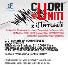 Siamo lieti di organizzare questo concerto per proporre una raccolta fondi a favore delle popolazioni colpite dal terremoto che si è recentemente verificato in Centro Italia. Aderiamo dunque volentieri all'iniziativa dell'Associazione Cori Piemontesi (ACP) "C(u)ori Uniti x il Terremoto".